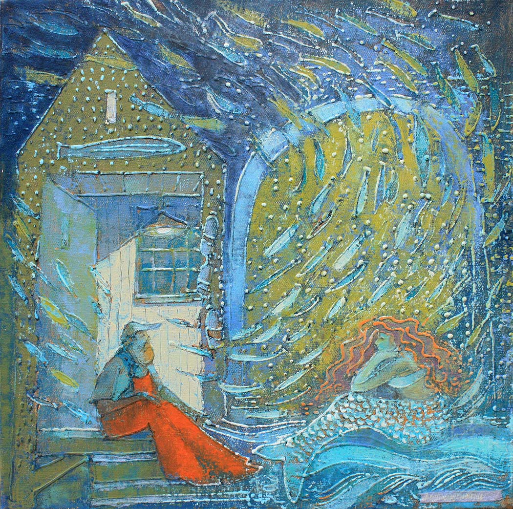 17731 The Chat mermaid acryl on canv 18×18 sm